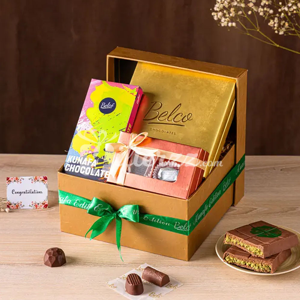 ₨13,095Surprise your loved ones with this beautiful Kunafa Hamper Small filled with yummy chocolate! A true gift of indulgence! Gold Hamper Small, 1x Kunafa Marigold Box of 9, 1x Kunafa Rose Gold Box Of 2, Kunafa Chocolate Bar 200 Gram, Greeting Card. Send this tulip basket by Belco across Pakistan…