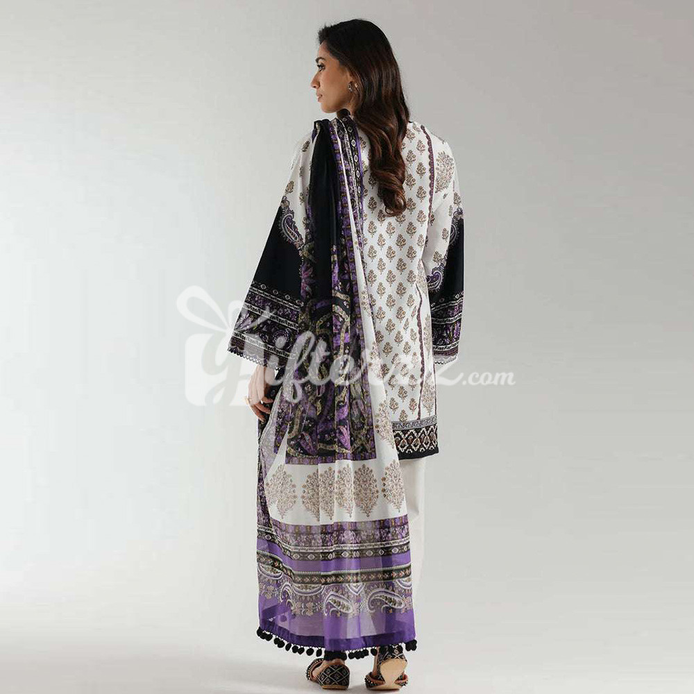 Gifterzz brings classy designs and comfortable is all you need this season. The Black and Purple Printed 3 Pcs Suit by Ethnc is un-stitched so your beloved can have it stitched the way she wants. A gift to the lady who means to you the most. Cheer them with trendy patterns and designs.