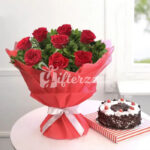 The flower bunch has 12 roses wrapped in red paper coupled with a black forest cake one topped with cherries with the most delightful flavor.