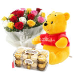 If you are looking for a gift to send to your beloved, Combo For Little Champ take a look at this stunning hamper of mixed flowers, neatly tied in a bunch, paired with a Winnie the pooh stuff toy, and a box of Ferrero Rocher.