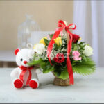 This Mix Roses Arrangement With Teddy Bear gift hampers with 12 mixed roses with a teddy bear is something your loved ones will never deny receiving. Gift this exquisite hamper to convey your best wishes and emotions to a special person.