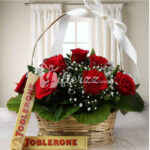 – Arrangement of 1 Dozen Red Roses with Baby Breath in a Basket.