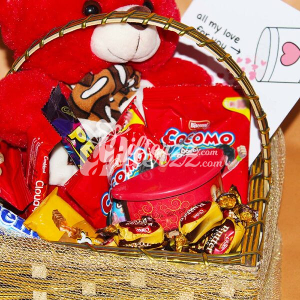 ₨3,520This attractive Teddy Bear with Chocolate Basket hampers, with delicious assorted truffles, bittersweet dark, heavenly milk, coffee, strawberry melody, almond, fruit n nut, and a cute Teddy Bear. Basket Size 8′ diameter. Teddy bear size 6-inch length. Net weight of chocolates: 250 gm. Send Teddy Bear with Chocolate Gift Basket…