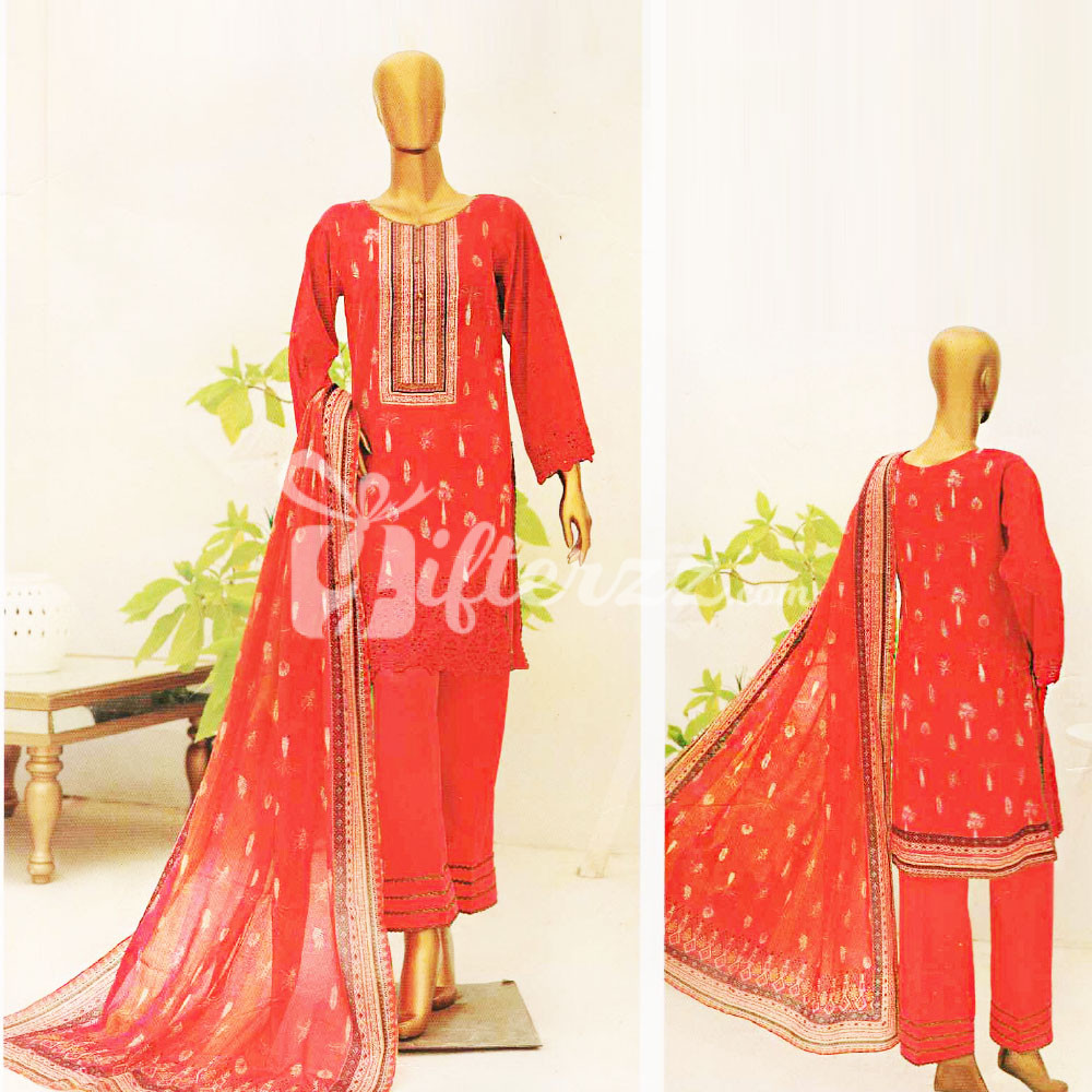 ₨5,250MTF brings classy designs, and comfort is all you need this season. The Red Embroidered 3 Pcs Suit is unstitched, so your beloved can have it stitched the way she wants—a gift to the lady who means a lot to you. Cheer them with trendy patterns and designs. Send it…