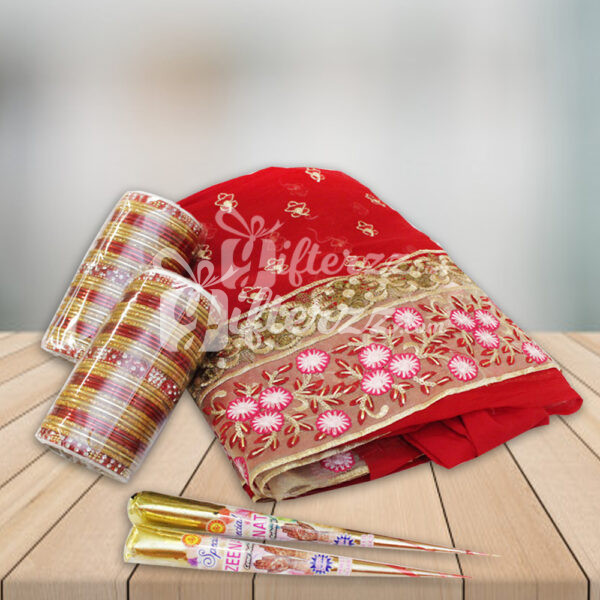₨7,980This Perfect Gift Hamper features a beautiful 3 pc unstitched embroidered chiffon suit with matching choori sets and Mehndi cones. Perfect to wear on a special occasion or formal gathering along with the shimmering choori set. The suit is unstitched so your beloved one can stitch it the way she…