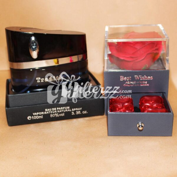 ₨4,580This excellent Royal Retreat combination offers a Tradition first copy 100ml perfume and 6 pieces of imported heart-shaped chocolates, an artificial red rose in a best wishes glass box. This is just the right combination to present to your loved one on his special day. Send this to your husband,…