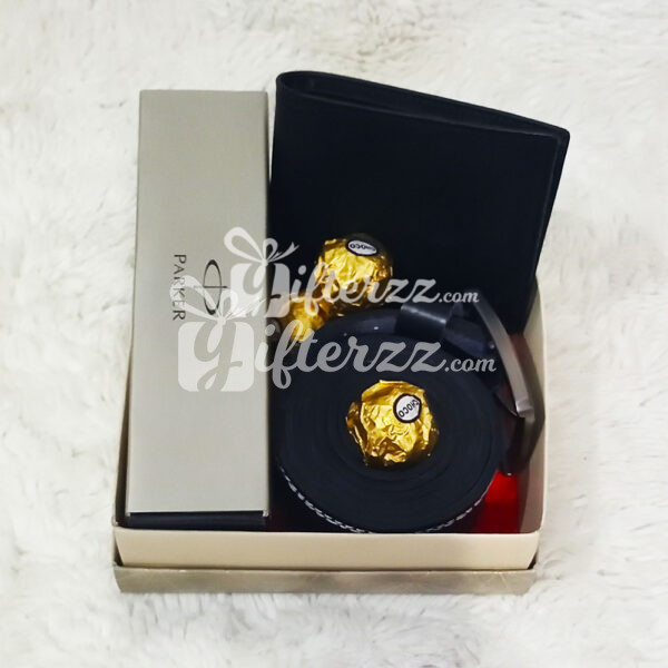 ₨12,660Check out this amazing Romantic Escape Gift. The perfect combo to gift to your Man online in Pakistan. Box Includes: 1 Brand Wear Suit 1 Parker Vector Ball Pen 1 Leather Wallet 1 Cookie Jar 1 AAA Quality Raybin Glasses 2 Toblerone bar Order online this men’s royal gift hamper…