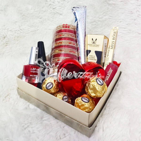 ₨11,520Send this beautiful Gift Gem Basket For Love that features so many mixed gifts. This combination is a complete package for your Wife, Mother, Sister, a friend for any special event like a wedding, engagement, Eid, Birthday, or any day. This product includes: 2 Bangle Sets 1 Dairy Milk Bar…
